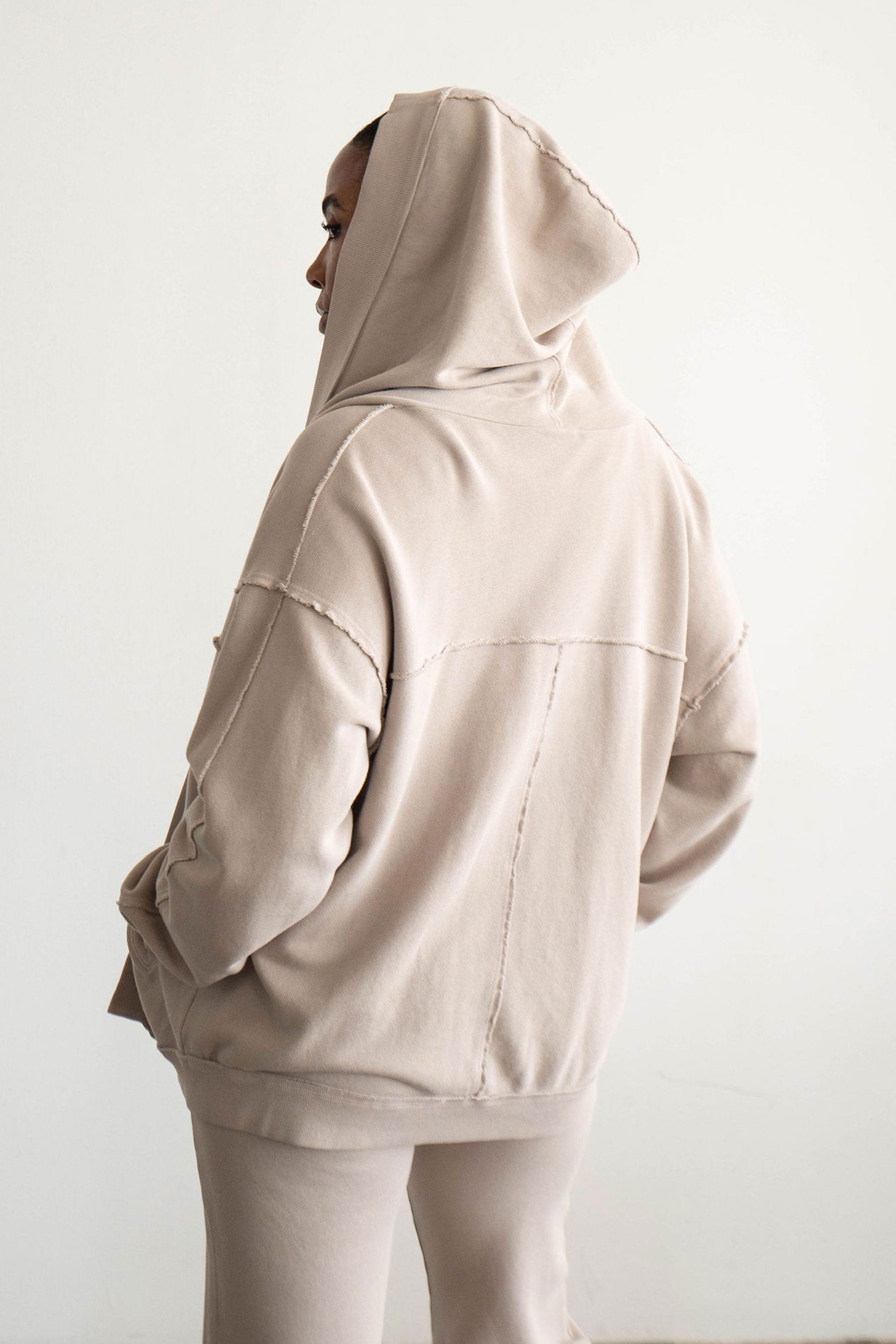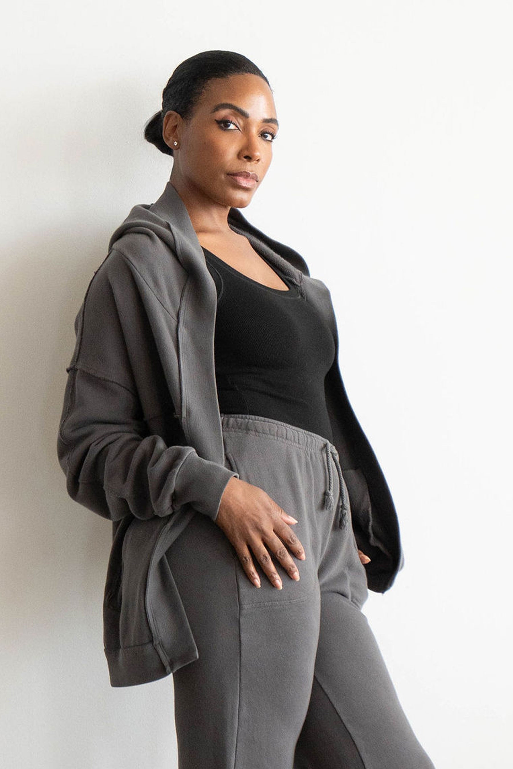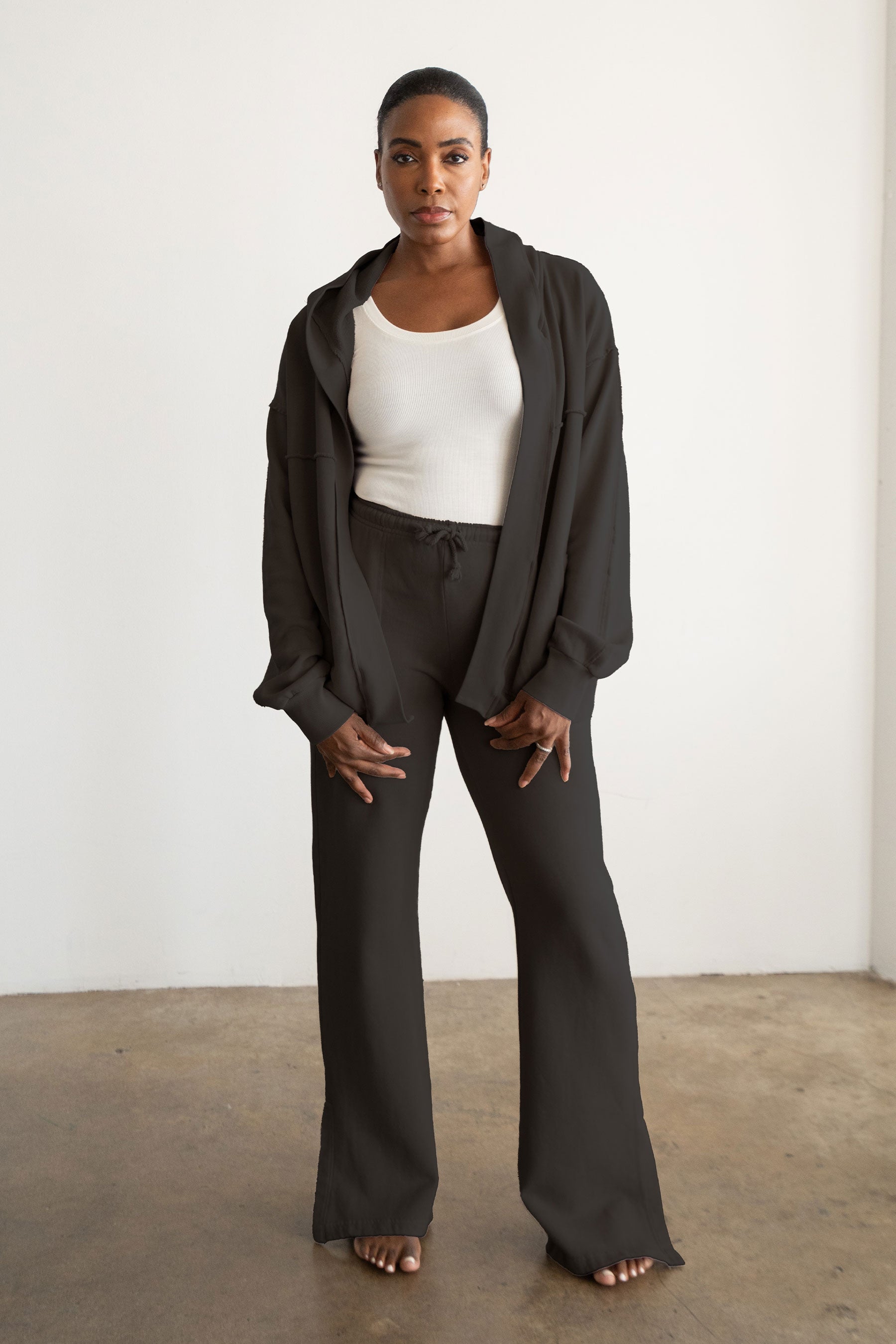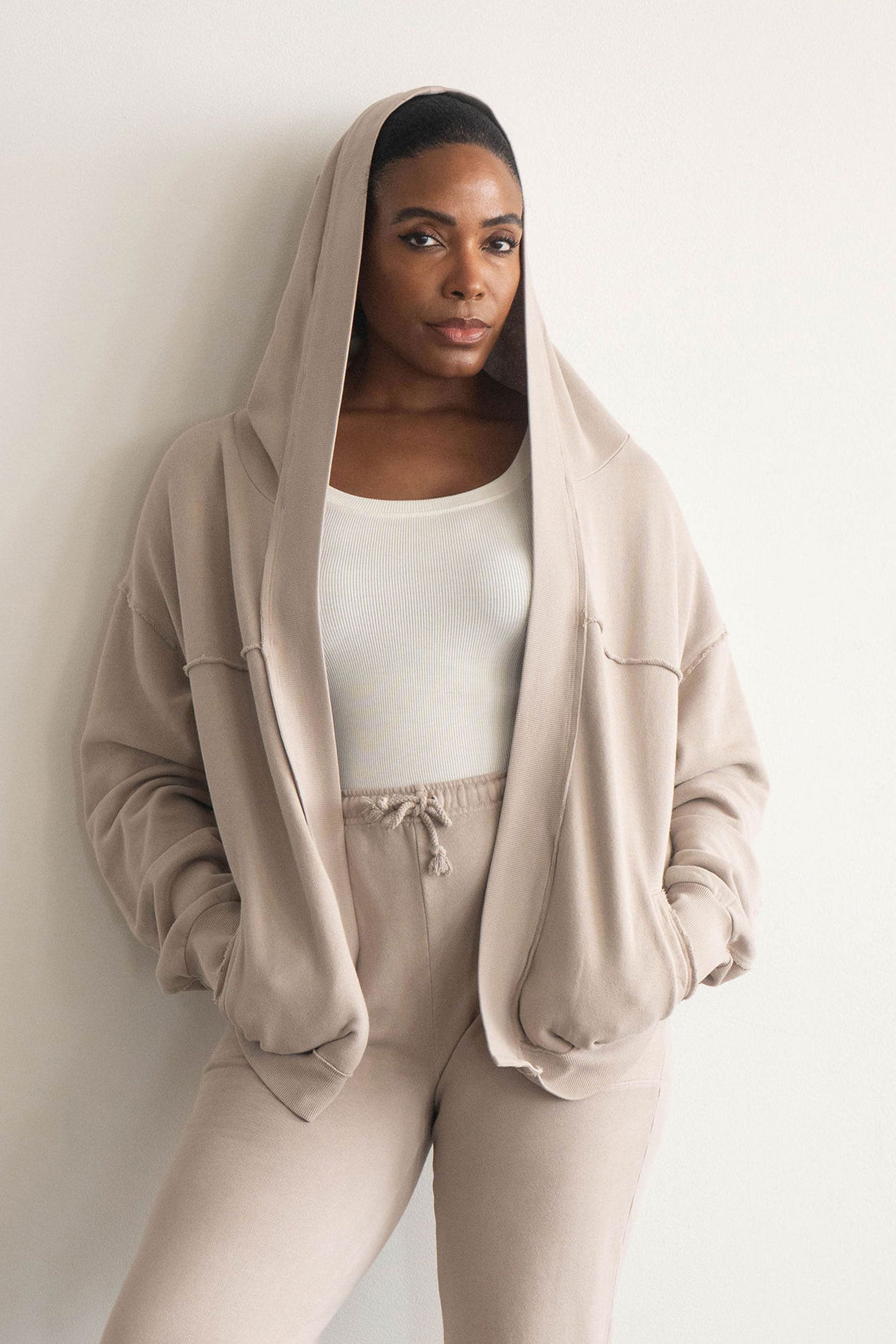 An elevated take on the open cardigan with a hood, crafted in washed fleece for easy comfort with a polished edge. Designed with exposed seam detailing and a relaxed fit, it layers beautifully and pairs perfectly with the matching jogger or flare pant.
