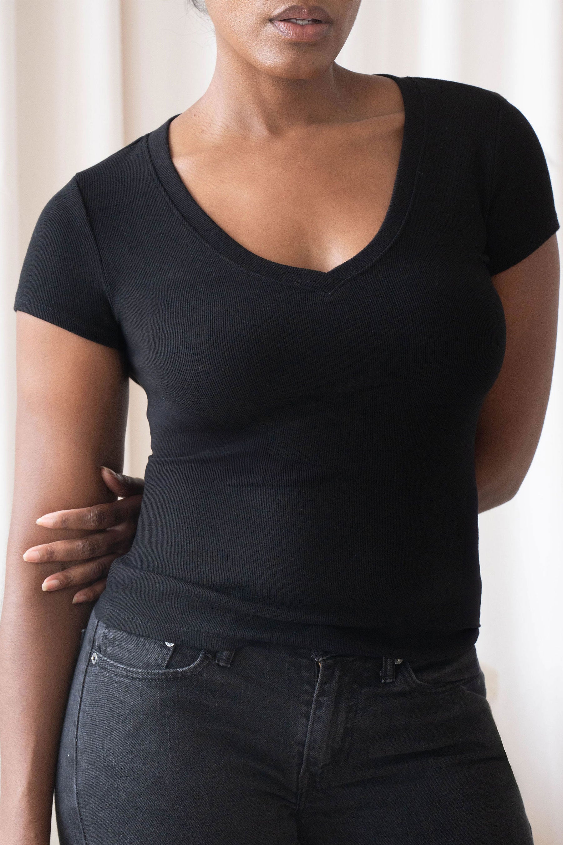 An elevated everyday tee in ribbed fabric, cut with a modest v-neckline for just the right touch of refinement. Its body-sculpting yet comfortable fit makes it perfect for layering or wearing solo.